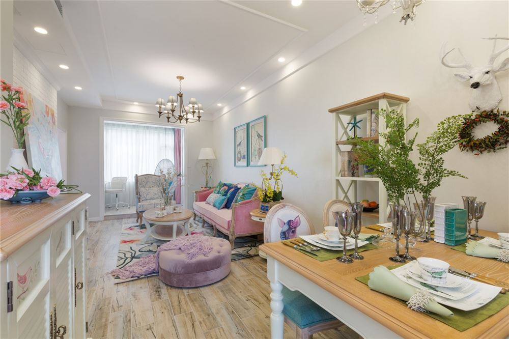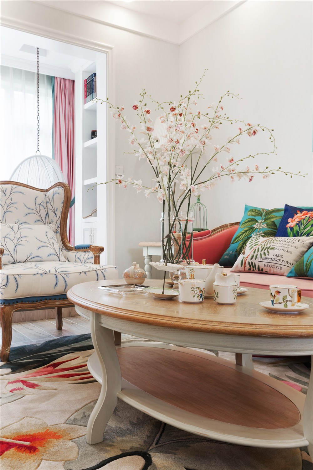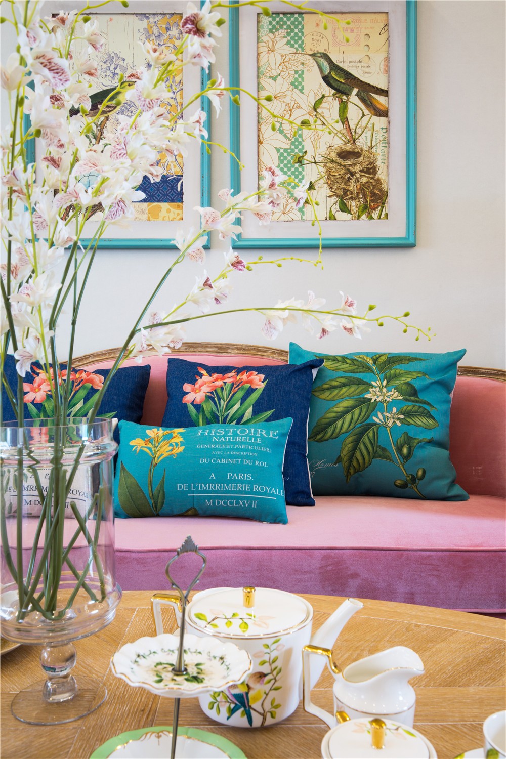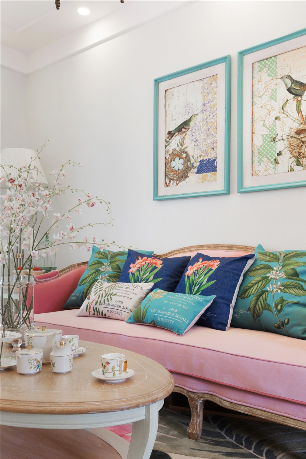 室內(nèi)客廳裝修效果圖,整個(gè)客廳選擇了簡(jiǎn)歐簡(jiǎn)潔,選線條圓潤(rùn),色彩豐富,用了自然綠和深藍(lán)來緩沖粉色沙發(fā)的跳躍感。