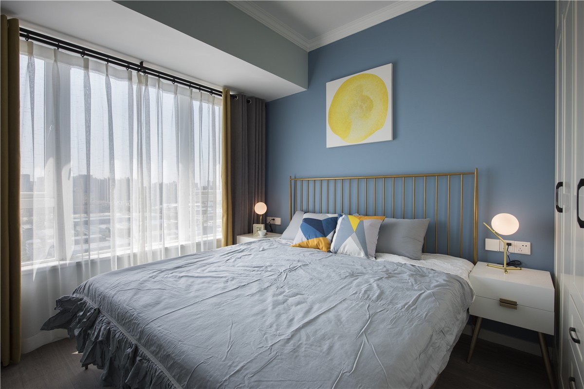 室內(nèi)主臥裝修案例,通過拆除主臥空間原有的飄窗來擴大主臥空間,滿足兩個床頭柜的需求。