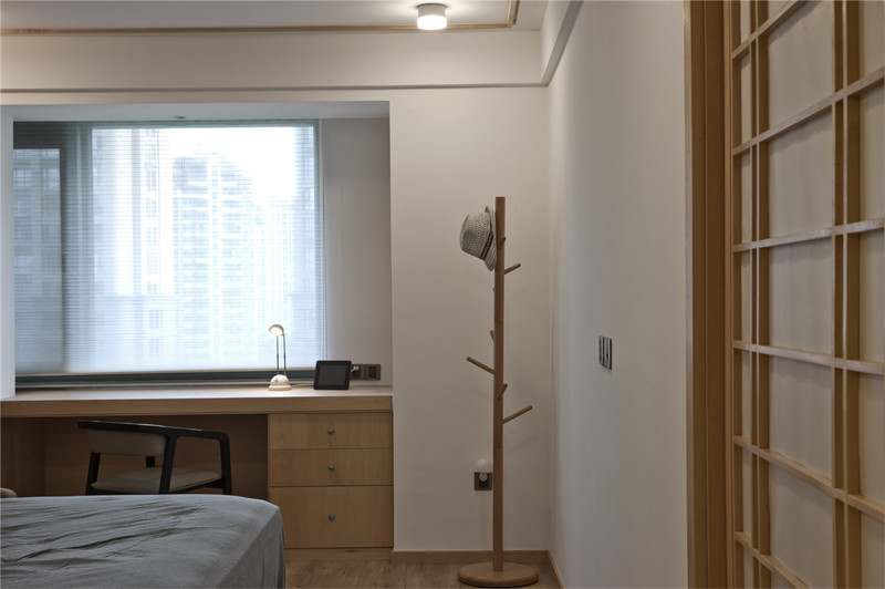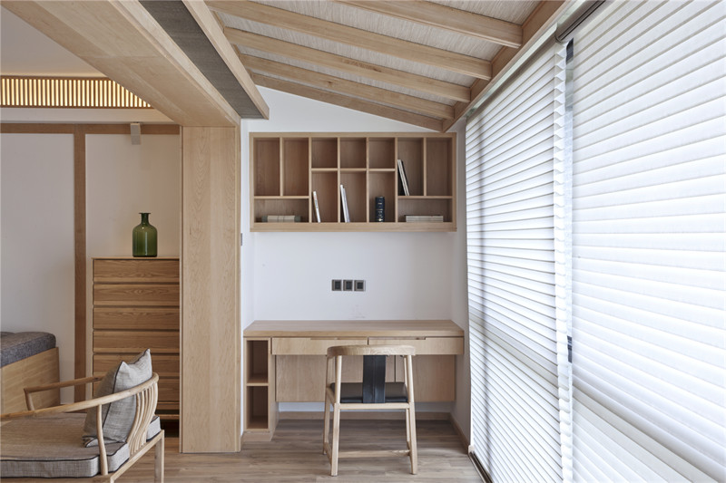 閑置的墻角位置活用為書房,內(nèi)嵌式的設(shè)計進(jìn)一步地節(jié)省空間,木質(zhì)的書架和書桌簡單又實用,緊扣家居風(fēng)格。