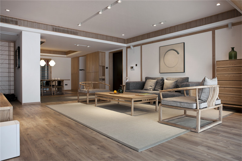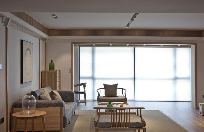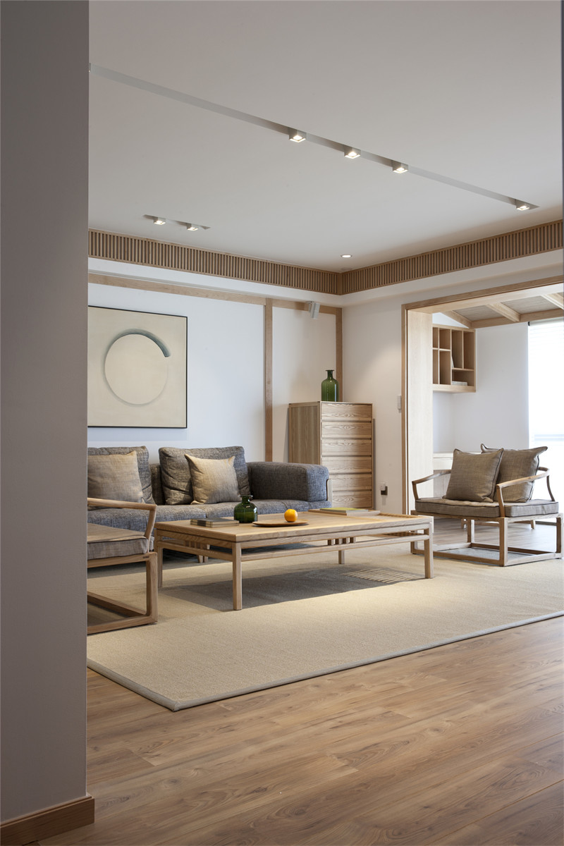 客廳灰色的棉麻布藝,米色的地墊和墻上不規(guī)則圓形的掛畫相呼應(yīng),完美演繹了和風(fēng),一種“有缺”的禪意。素色空間難免會顯得單調(diào),巧妙地利用細(xì)節(jié)點綴能獲得很好的效果,如設(shè)計師在客廳放置的綠色玻璃瓶和綠植的融入能夠有效地增強(qiáng)空間活力。