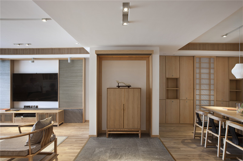 客廳電視墻的一側(cè)是茶室入口,進(jìn)入茶室即可看見一整面的內(nèi)嵌柜子,其中擺放著屋主的各種收藏。靜坐于此,煮上一壺茶,會一會老友,就著茶香木香,談天說地,這才是生活原本的模樣。