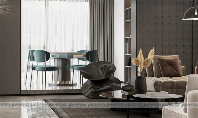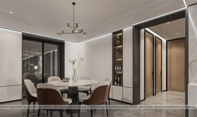 設(shè)計(jì)師巧妙的布置一組白色的玄關(guān)柜,擺上極具藝術(shù)感與美感的現(xiàn)代擺件作為裝飾,金銀交匯,空間精致感迎面而來(lái),讓人迫不及待地想入室一探究竟!