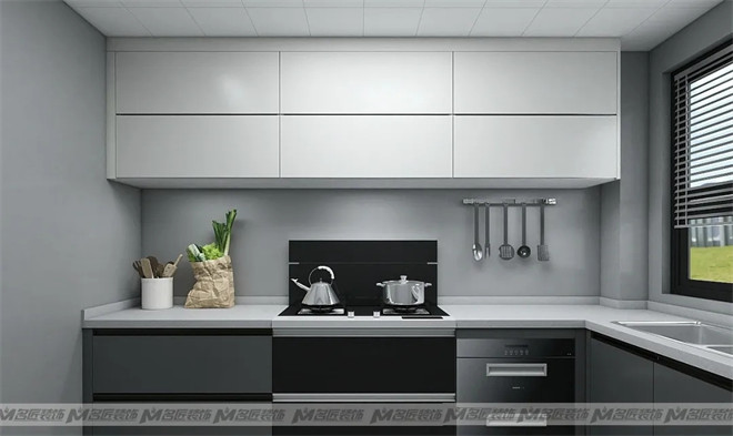 廚房?jī)?nèi)部做了L字型的布局方案,讓廚房擁有更多的儲(chǔ)物空間,功能分區(qū)有所側(cè)重,比較靈活多變。白色吊柜與深灰色櫥柜承上啟下,延續(xù)空間深淺搭配的風(fēng)格,不顯單一枯燥。