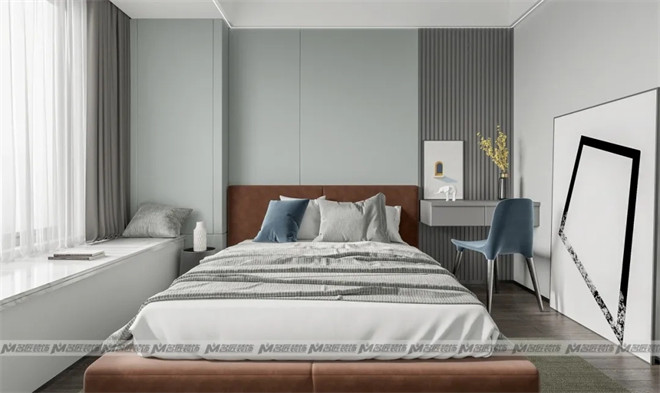 次臥的設(shè)計(jì)顯得素雅干凈,淺綠色的床背景點(diǎn)亮我們的視線,在感官上追求自然與靜謐,體驗(yàn)內(nèi)斂高級(jí)的品質(zhì)棲居。