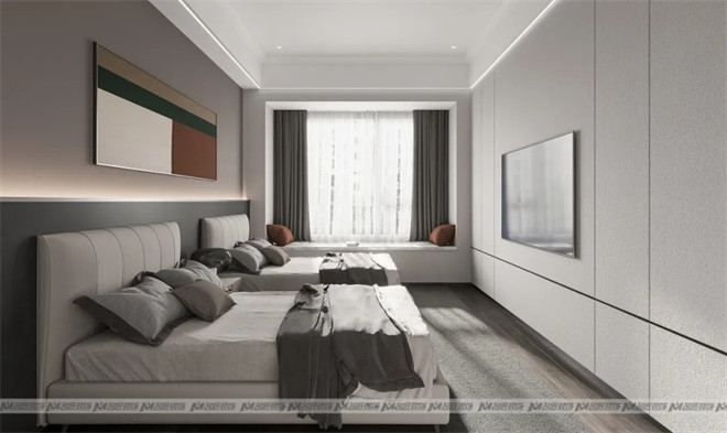 兒童房采用現(xiàn)代化的榻榻米+書桌+衣柜的一體化多功能設(shè)計(jì),既能滿足孩子休息、學(xué)習(xí)、娛樂(lè)及收納的基本要求,又保持了整體風(fēng)格的一致,美觀實(shí)用。