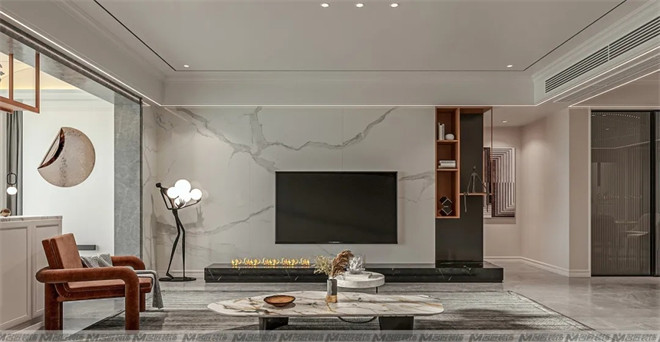 客廳空間簡(jiǎn)潔大方,米灰色的布藝沙發(fā)散發(fā)著溫馨的味道,三色抱枕點(diǎn)綴其中,并與地毯、毛毯、單人椅的顏色相呼應(yīng),隨意又充滿設(shè)計(jì)感。大理石材質(zhì)的電視背景墻及茶幾,帶來(lái)輕奢質(zhì)感的視覺享受,提升空間的檔次。