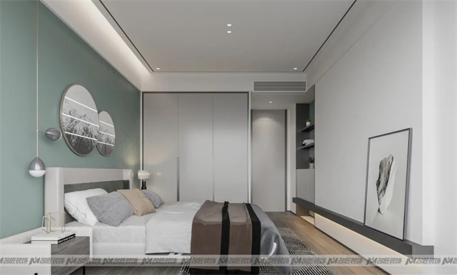 主臥的基調(diào)設(shè)計(jì)打破固化的審美觀,采用清新治愈的馬卡龍綠色作為床頭背景墻顏色,鋪上灰色木地板,裝點(diǎn)色彩和諧的吊燈、印象畫、掛畫等軟裝元素,鑲嵌上些許金邊,凸顯輕奢之美,簡(jiǎn)潔而浪漫,這是心動(dòng)的感覺!