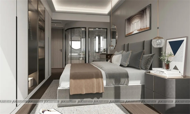 主臥低飽和的配色方式,再輔以金屬色的軟裝點綴,賦予空間深邃感及和諧感,宜家更宜居,還有一個亮點是全玻璃的衛(wèi)生間設(shè)計,既節(jié)省空間又增加透光度,采用玻璃隔斷將沐浴區(qū)與梳洗區(qū)、如廁區(qū)分開,做好干濕分離