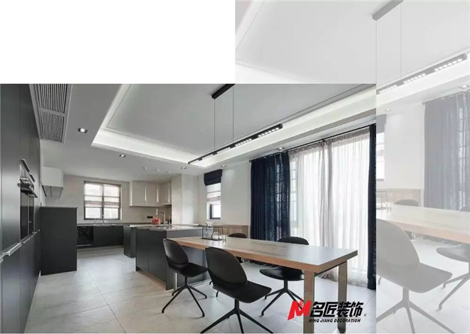餐廳便是一張簡單的木餐桌,吊燈的造型、天花的設(shè)計,以及整個空間黑灰調(diào)的配色,都貫穿了極簡主義