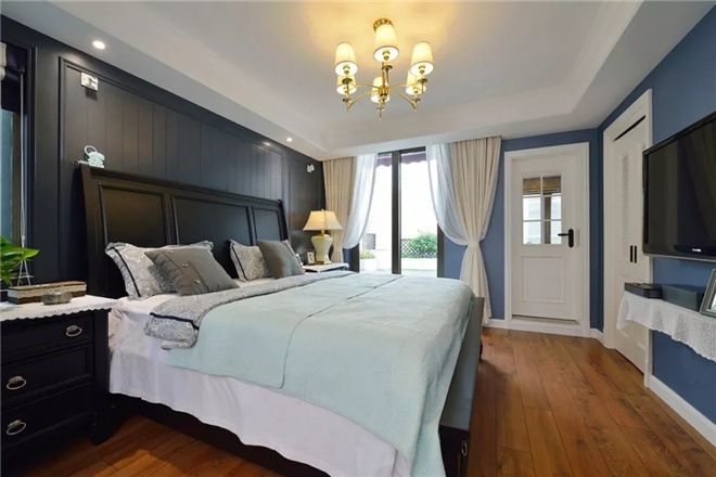 臥室突出了生活的舒適和自由。特別是在墻面色彩選擇上,自然、懷舊、散發(fā)濃郁泥土芬芳的色彩是美式鄉(xiāng)村風(fēng)格的典型特征。