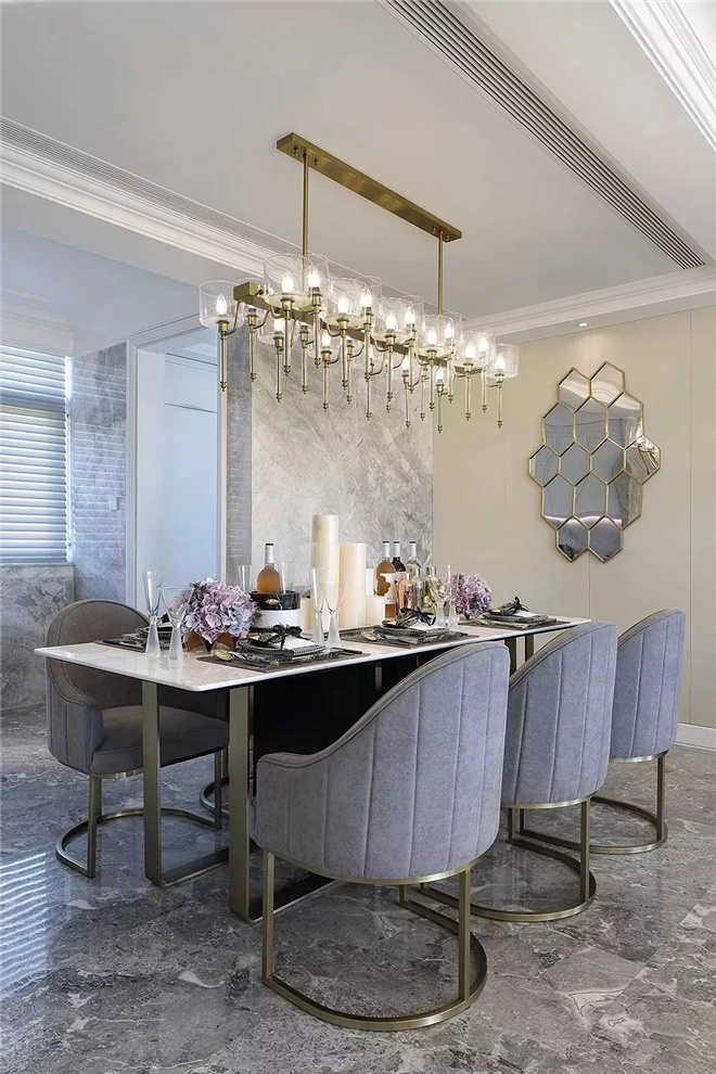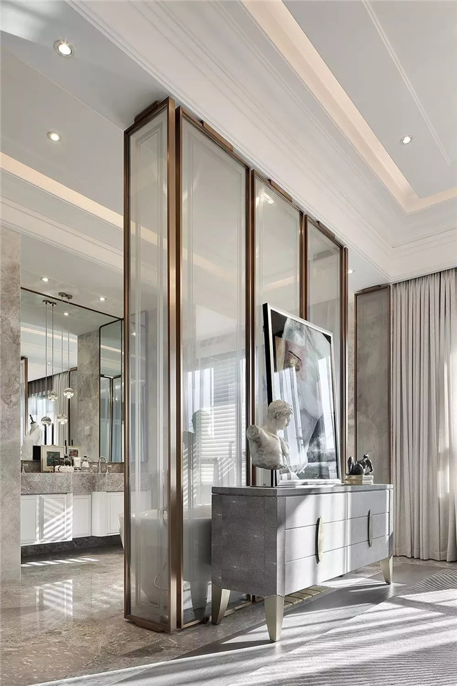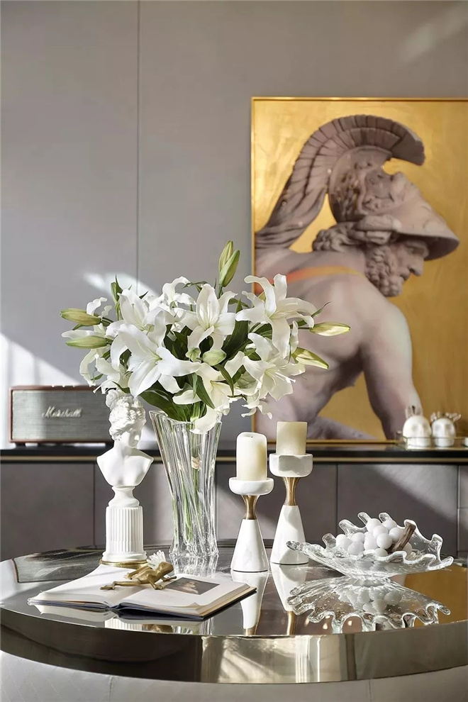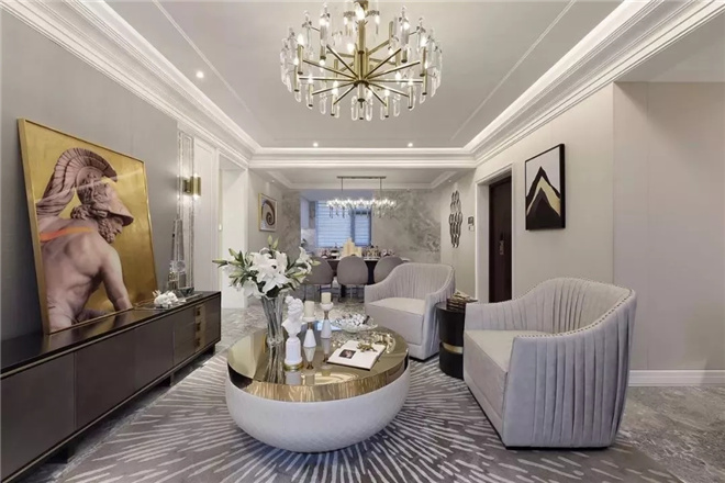 步入客廳,新貴的奢華感與典雅氣息迎面而來,熱烈卻不浮夸。在空間米灰色色調(diào)的基礎(chǔ)上,配置定制家具,其觸感舒適、線條強(qiáng)烈而精簡,大理石、金屬、皮質(zhì)、木飾等多種異材搭配,簡單中蘊(yùn)含奢華。