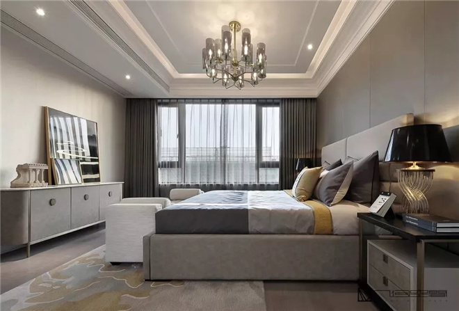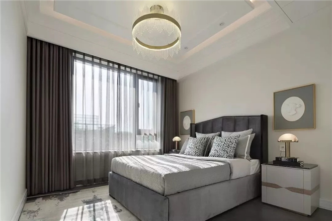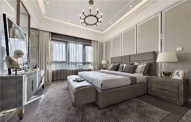 主臥室摒棄復(fù)雜陳設(shè),用簡約手法詮釋了一個舒適的空間環(huán)境。臥室內(nèi)沉穩(wěn)睿智的咖色家具與質(zhì)感極強(qiáng)的床飾,于細(xì)節(jié)處鍛造低調(diào)奢雅;藝術(shù)感十足的斷臂雕塑增添了空間的文藝氣息