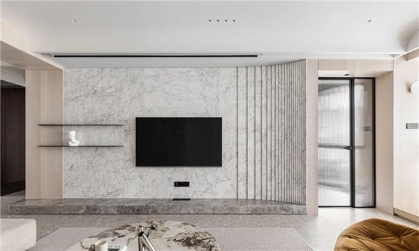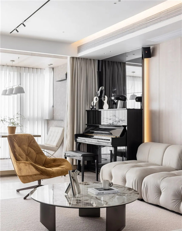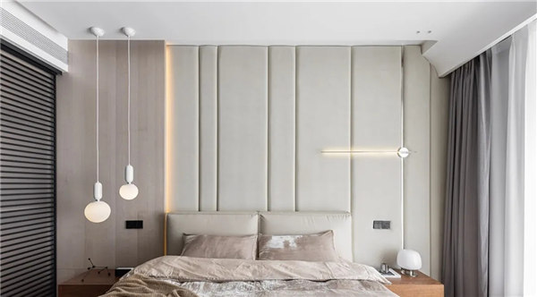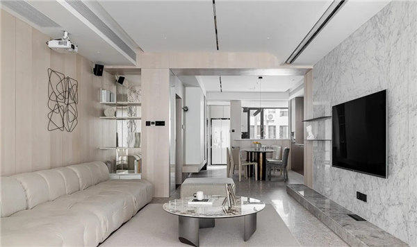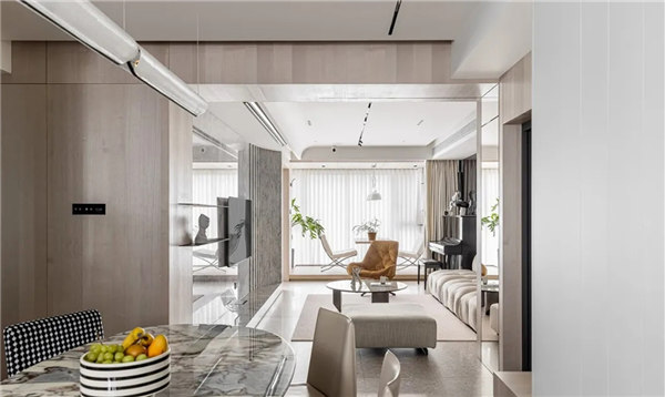 全屋采用無主燈和局部線性燈光設(shè)計,營造放松、溫馨氛圍,整體以白色、淺色的木飾面為主,搭配小面積的鏡面穿插,融合自然紋理的石材點綴,通過對材質(zhì)、細(xì)節(jié)的整合把控,進(jìn)一步達(dá)到對空間本身的塑造以讓心靈找到歸屬