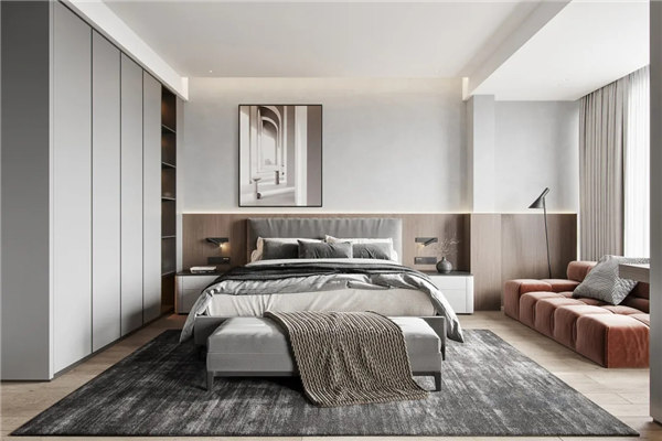 米黃色紋理地毯,搭配大地色系床品,沉靜溫和的感覺,質感十足。色彩搭配舒適高級,無棱角的家具與陳設造型慵懶隨性,為空間帶來寧靜氛圍和藝術性美感,增添無限柔情浪漫。
