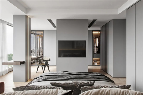 主臥無主燈設計,局部分散的照明,不僅實用還讓客廳更有層次感與格調,放棄復雜造型的吊頂,使用隱藏筒燈和臺燈寬敞大方。臺燈散發(fā)出的柔和燈光,的與空間色調完美融合,散發(fā)著柔和光芒,輕奢而不張揚。