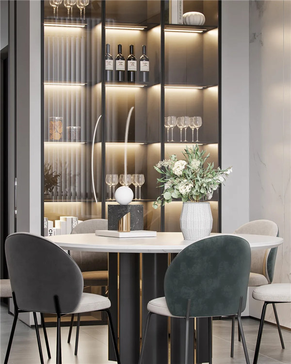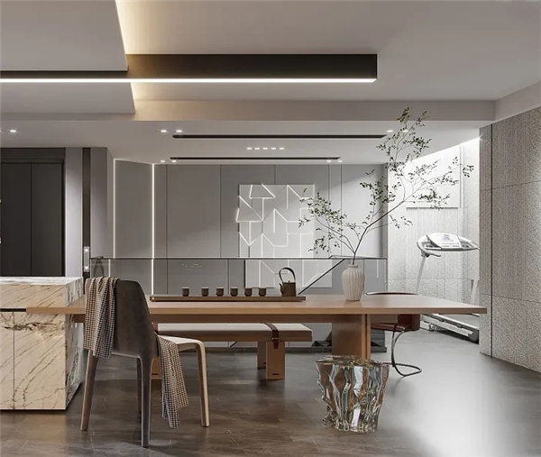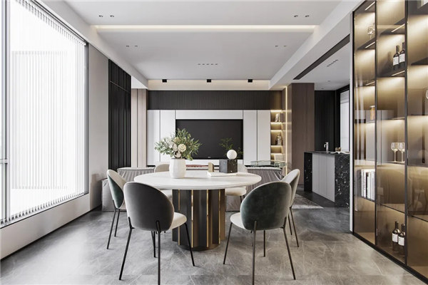 餐廳色調個性,以灰色餐椅搭配米白色坐墊,白色大理石臺面,搭配無主燈,與客廳遙呼相應。撞色設計與線條交錯有致,讓空間顯得飽滿,富有層次。不張揚的奢華才是兼顧生活品質與卓越風范的展現(xiàn)。