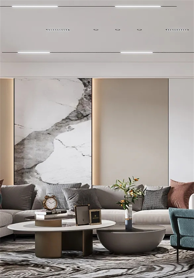 家具的流線造型為這個(gè)塊面感的空間更增添了藝術(shù)的曼妙律動(dòng)。白瓷搭配蘇麻離青,是啟發(fā)自元青花的經(jīng)典藝術(shù),產(chǎn)生出明朗高貴的色彩效果。