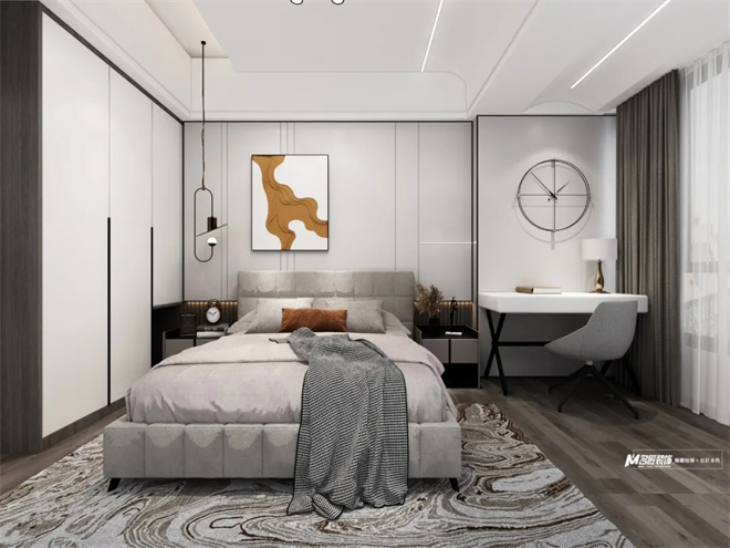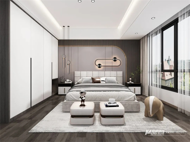 臥室中色彩靈活運(yùn)用,形成自然靈動又不失沉靜的環(huán)境,大面落地窗保證了空氣,光影與人動線的流暢性