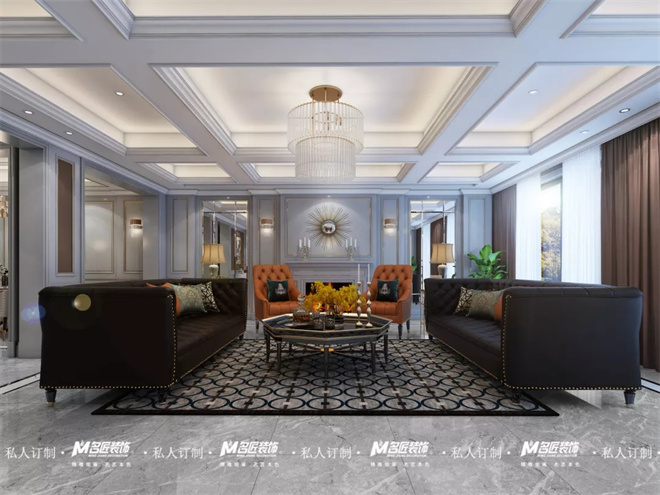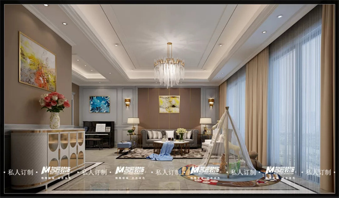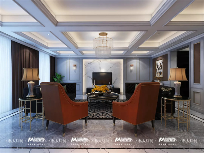 客廳圍繞美式輕奢風(fēng)格,突出都市、時尚、小資的氛圍打造,不同于傳統(tǒng)美式,更強調(diào)輕奢的格調(diào)。