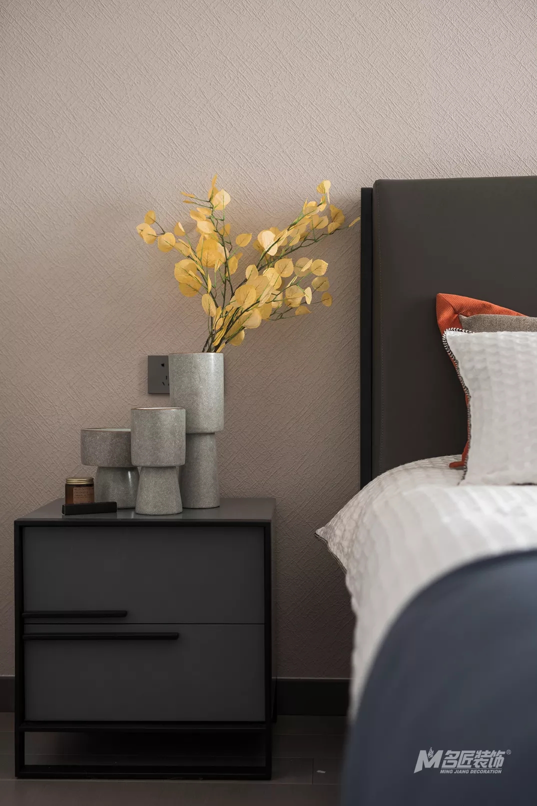 造型簡約的床頭柜,擺放著精致巧妙的擺件,為一片純色的天地注入了新的秀色精致。