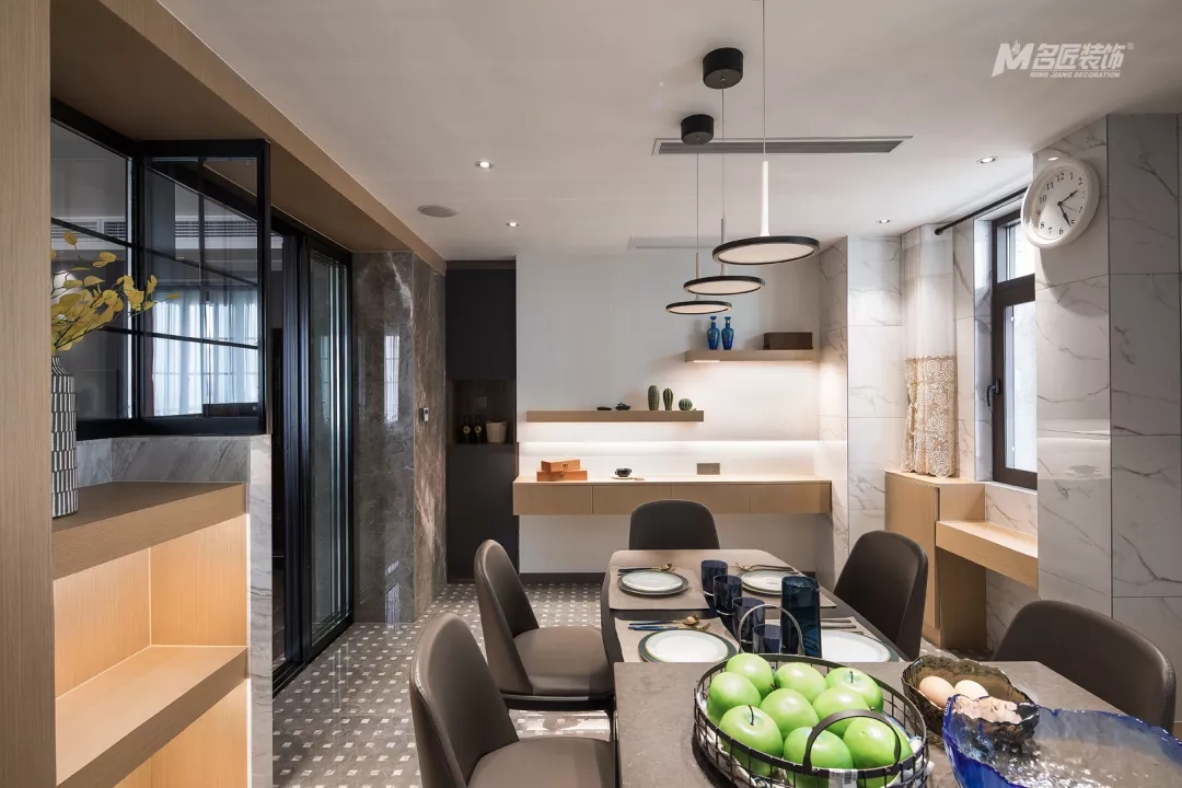 來到餐廳,也是一幅非常精致簡約的畫卷,黑白灰三色兼糅,營造時(shí)尚的烹飪就餐氛圍。