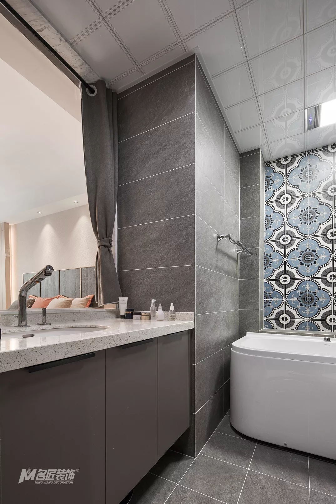 主臥套房內(nèi)的衛(wèi)生間,延續(xù)整體風(fēng)格的高級灰色調(diào),彰顯時(shí)尚潮流的同時(shí),也顯得空間更加干凈整潔。