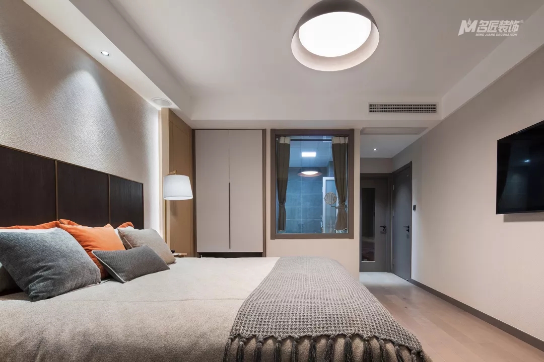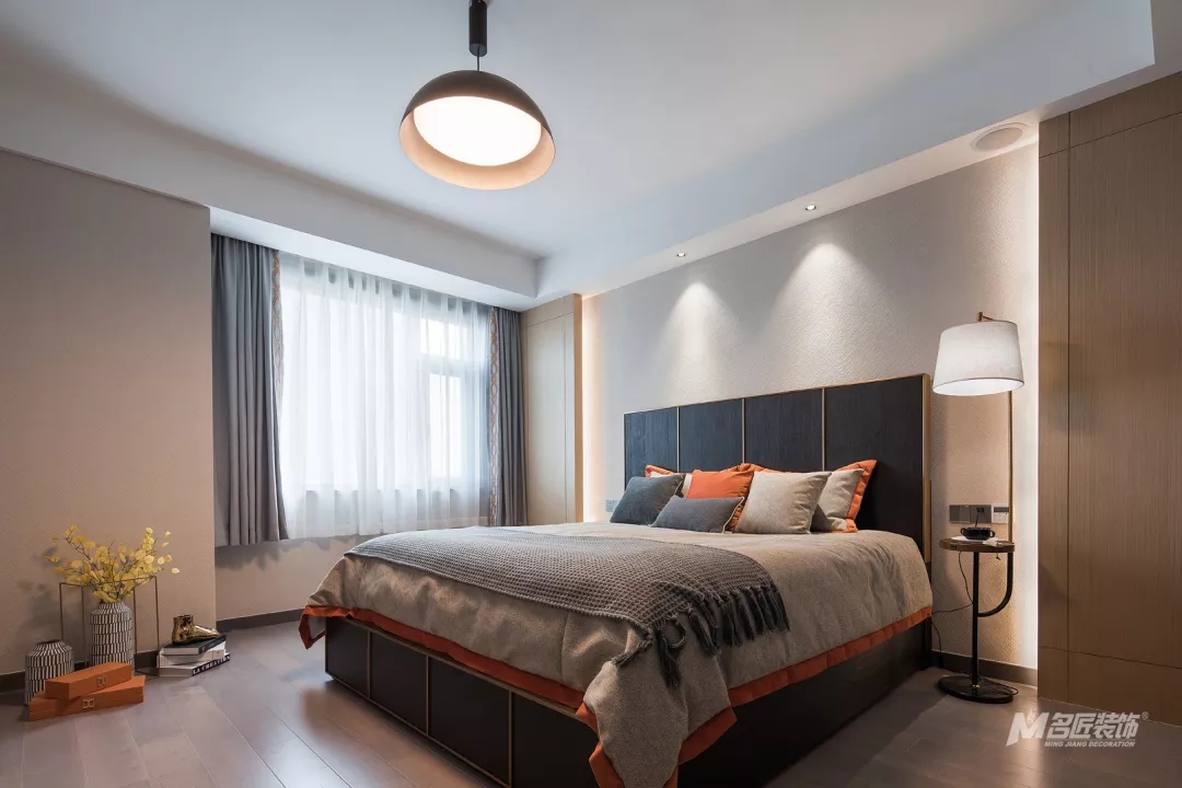 主臥的吊燈簡約時(shí)尚,整個(gè)房間的設(shè)計(jì)簡單但很有質(zhì)感和品味。