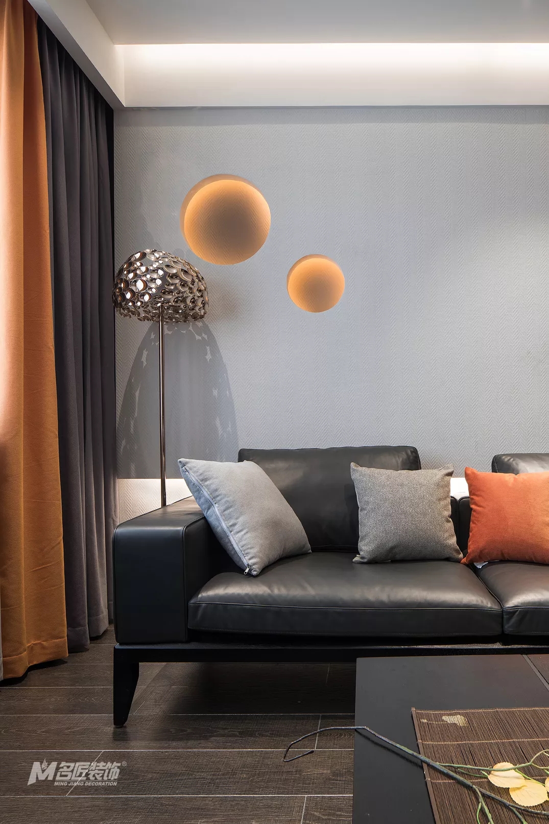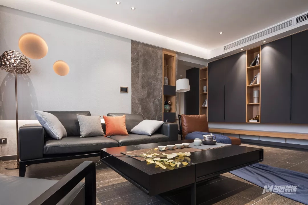 整潔清爽的客廳,由高級灰搭配著原木色、愛馬仕橙,時(shí)尚氣息濃郁,又有著自然的溫暖感受。