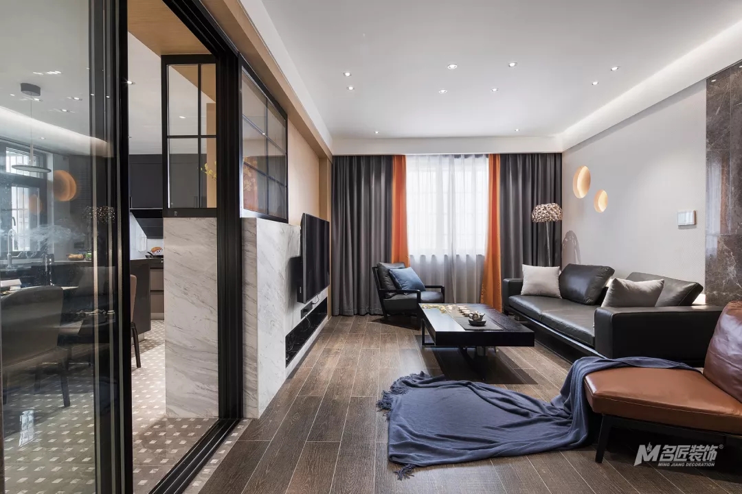重新規(guī)劃改造的電視背景墻,以半高大理石隔斷加上木飾面,一冷一暖,精致的棱角,空間顯得規(guī)整也別有一番情調(diào)。