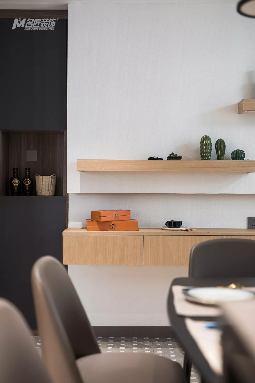 廚餐廳的另一端,墻面設(shè)計(jì)了木制隔板并裝飾了一些小物品,為烹飪、就餐時(shí)光增添了不少情趣。