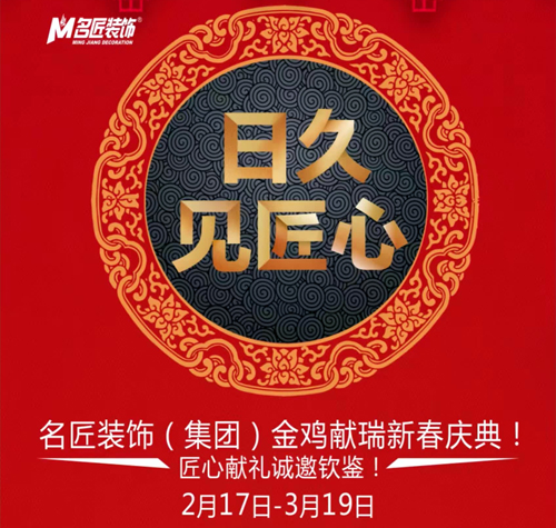 2017年名匠裝飾金雞獻(xiàn)瑞新春慶典,匠心獻(xiàn)禮誠邀欽鑒!2月17日——3月19日全國238城聯(lián)袂獻(xiàn)禮匠心服務(wù)!“日久見匠心”活動分為兩個主題——《春天的禮物》、《為愛點亮的小夜燈》。名匠裝飾新春盛宴“日久見匠心”活動感恩回饋一大波鉅惠在等候各位光臨,對于需要裝修的朋友們,如果還沒有想好的話,就來名匠裝飾吧!