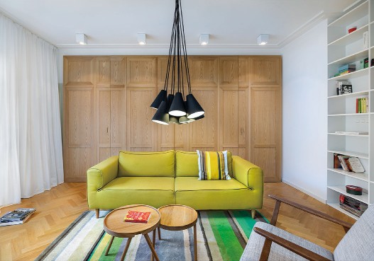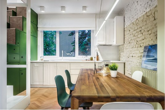 這是一間位于保加利亞的公寓,從結(jié)構(gòu)、模式甚至是顏色來看,這間公寓似乎比較單調(diào),很難找到出彩之處??蛷d里,最搶眼的也只不過是一張青綠色的普通沙發(fā),還有一"盞"頗具創(chuàng)意的吊燈。整個(gè)空間色調(diào)都是綠自搭配,綠色給人清新舒暢的感覺,而白色則像純真潔凈的微笑那般干凈。其實(shí),公寓是一個(gè)開放性的大房間,沒有門或者隔板,卻把每個(gè)空間都劃分完整;綠色的閣樓樓梯,看似是—個(gè)個(gè)收納柜,但設(shè)計(jì)師把廚房的電器都藏在樓梯柜里,省略了空間位置,又美觀實(shí)用;更隱秘的是,在卡其色書柜的后面是一個(gè)書房,而白色書柜后面則是一個(gè)單獨(dú)的臥室??臻g簡而不單,打破常規(guī)設(shè)計(jì),結(jié)合空間的地理特點(diǎn),給平凡的生活制造點(diǎn)驚喜。